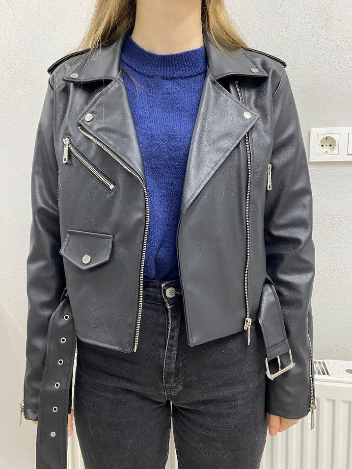 siyah renkli, deri gümüş fermuar detaylı kemerli deri ceket sadece bi kaç giyilmiştir hiç bi yerinde yırtık vs kusur yoktur