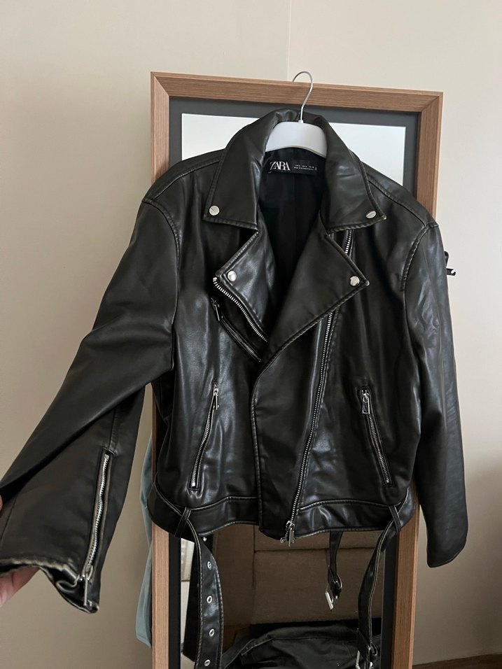 Siyah, deri, bikers tarzı, kesimli ve tokalı detaylara sahip kadın ceket. Askılı kollu, midi boy, günlük şıklık için ideal.
