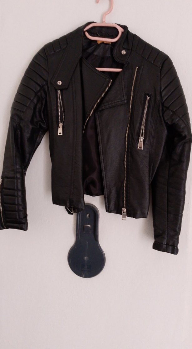 Bu siyah deri biker ceket, oturmalı kesimi, çıtçıtlı yakası ve tokalı detaylarıyla rock punk tarzına uygundur. Askılı kollara ve normal uzunluğa sahiptir.