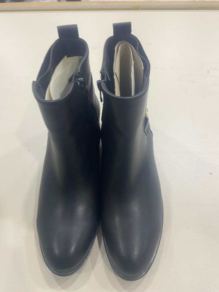 Siyah renkte, dolgu topuklu ve tokalı kadın botu. minimalist ve günlük sokak tarzına uygun.