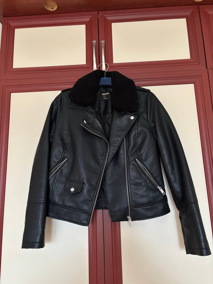 Bu siyah deri biker ceket, fitted kesim, yakalı ve tokalı detaylara sahiptir. Yumuşak yakalı ve fermuarlı ceplidir, günlük kullanım için uygundur.