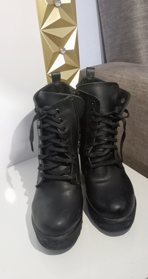 Siyah deri, dolgu topuklu kadın botları, tokalı detaylı, günlük rahat kullanıma uygun, trend goth sokak stilinde.