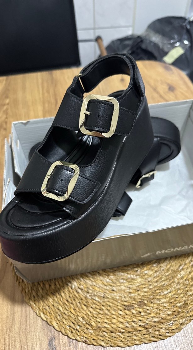 Siyah deri kadın sandaletler, dolgu topuk ve tokalı kayışlara sahiptir. Minimalist ve çağdaş tasarımıyla günlük kullanıma uygundur. marka temsili