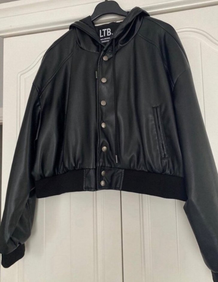 Siyah deri, uzun kollu, düğmeli ve bol kesim kadın ceket. Yüksek yaka ve günlük sokak stili için uygundur. İçinde LTB markası bulunur.