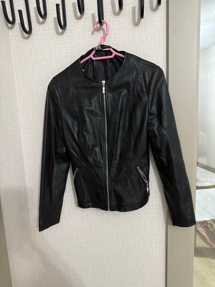 Fermuarlı cepler ve ön kısmı fermuarlı, siyah deri, dar kesim biker tarzı uzun kollu kadın ceketi. Günlük kullanım için uygundur.