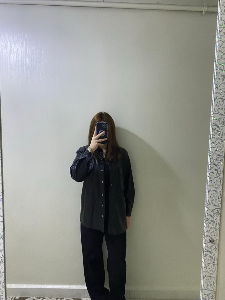 Siyah renkte, bol kesim ve uzun kollu, notlu yakalı denim deri gömlek ceket. Günlük kullanıma uygun, rahat ve şık bir tarz sunar.