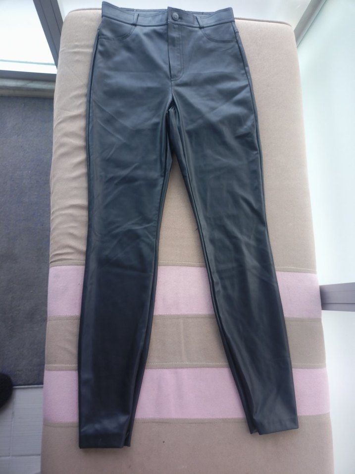 zara )Kemer detaylı, siyah deri dar paça pantolon. Midi boyda ve desen içermeyen düz yapısıyla gündelik kullanıma uygundur.
