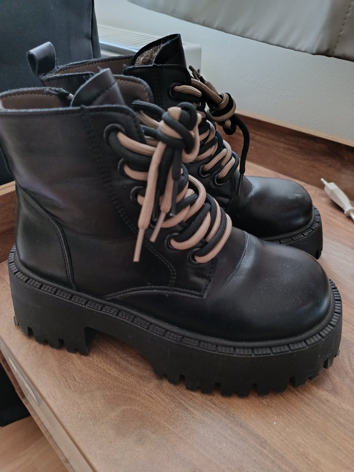 Siyah deri platform topuklu botlar, tokalı ve kalın tabanlıdır. Goth tarzı sokak stiline uygun, günlük kullanıma elverişli ve trend bir görünüme sahiptir.