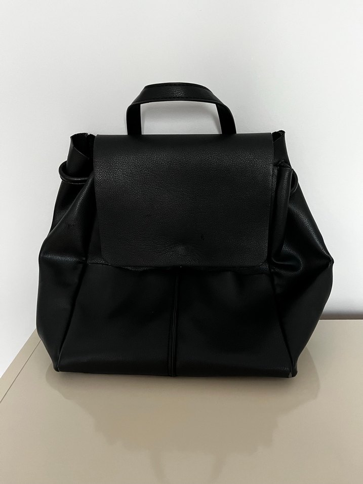 Siyah deri sırt çantası, tokalı kapak ve minimalist, çağdaş tasarıma sahiptir. Günlük kullanım için sade, desensiz görünüm sunar.