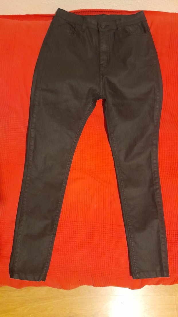 siyah deri görünümlü mumlu pantolon, etiket 38 ama kalıbı çok dar esneme payı yok. S hatta xs bile olur. defosu yok