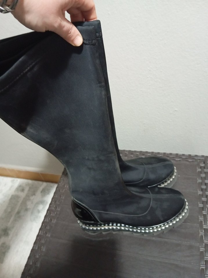 Siyah, diz boyu kauçuk botlar, kama topuklu ve tokalı detaylara sahip. Avant-garde tarz için uygun, günlük kullanıma elverişli.