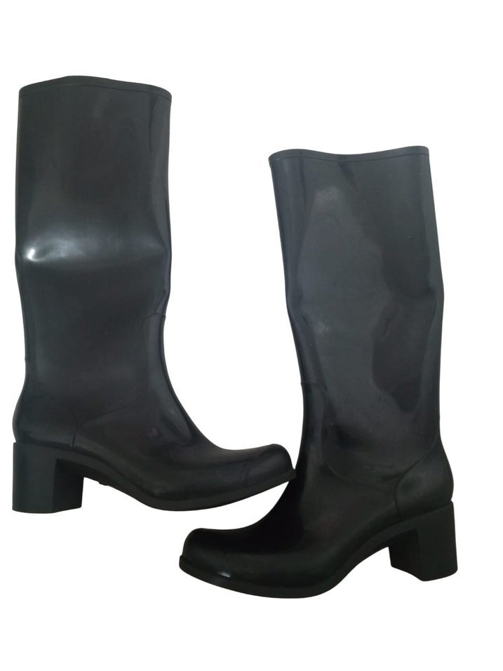 Siyah, blok topuklu, kauçuk malzemeden dizüstü botlar. Desensiz ve şık gotik tarzda, günlük kullanıma uygun.G&G marka deri