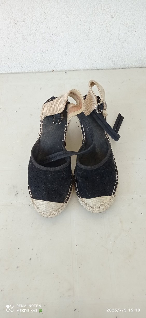 Siyah dolgu topuk, kauçuk tabanlı, tokalı kayışlı kadın espadril, günlük kullanım için bohem tarzda.