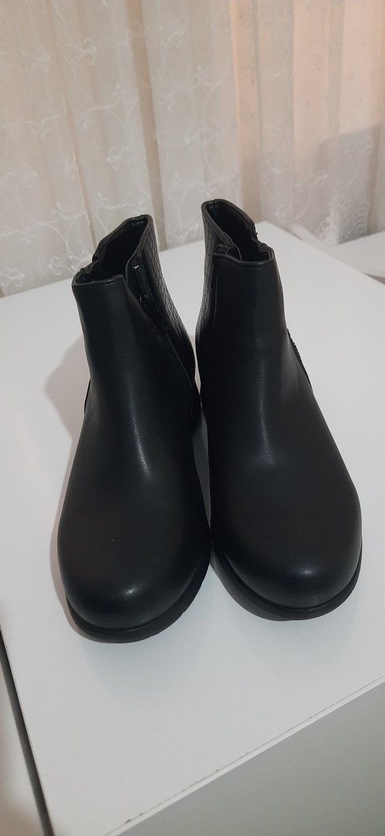 Siyah, lastik malzemeden dolgu topuklu, tokalı, sade tasarımlı kadın botu. Minimalist goth stilinde, günlük kullanıma uygun.