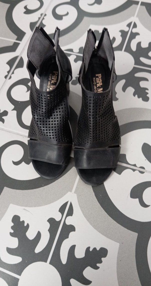 Siyah dolgu topuklu kadın sandalet, tokalı ve delikli tasarıma sahip. Kauçuk malzemeden üretilmiş, gotik esintili sokak stiline uygun. Günlük kullanım için ideal.