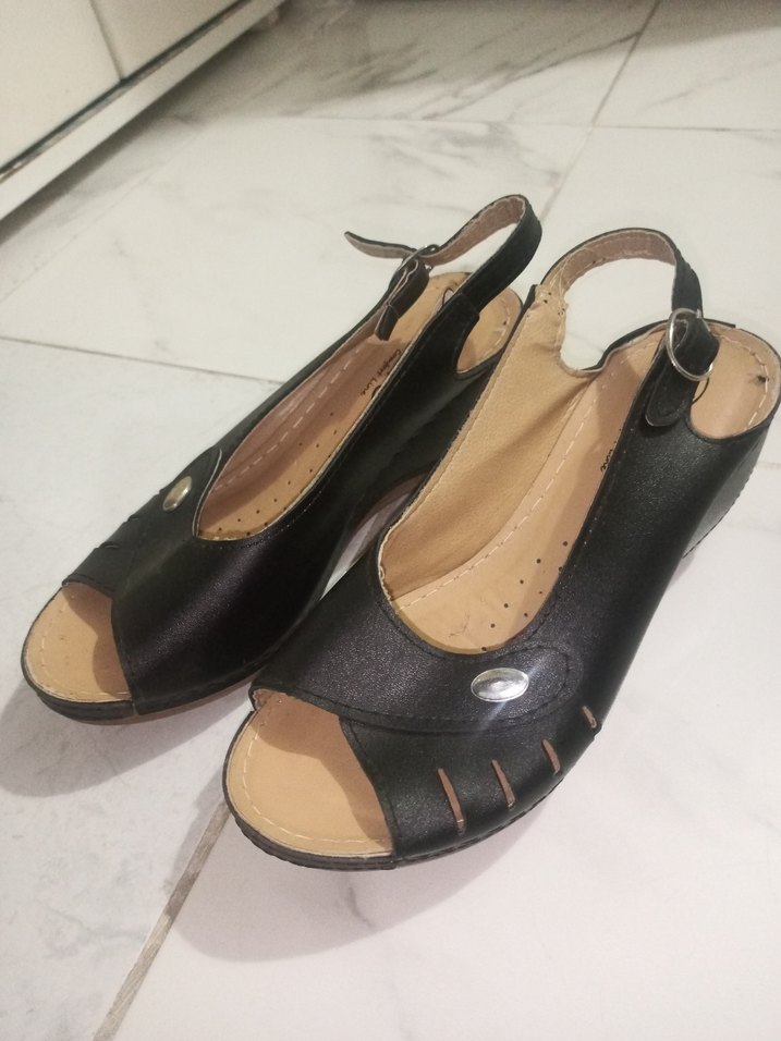 Siyah, tokalı bantlı ve açık burunlu dolgu topuklu kadın sandaletleri. Kauçuk malzemeden, günlük kullanıma uygun.
