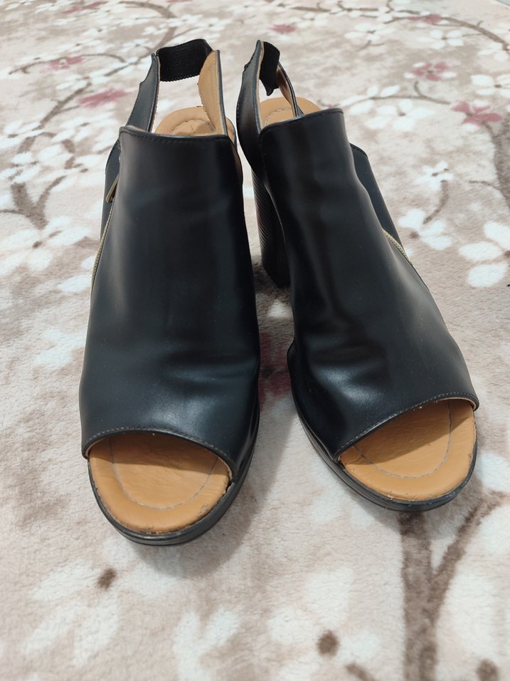 Siyah dolgu topuklu, tokalı kauçuk malzemeden yapılmış sandaletler. Minimalist ve çağdaş tarzda, günlük kullanıma uygun şık ayakkabılar.