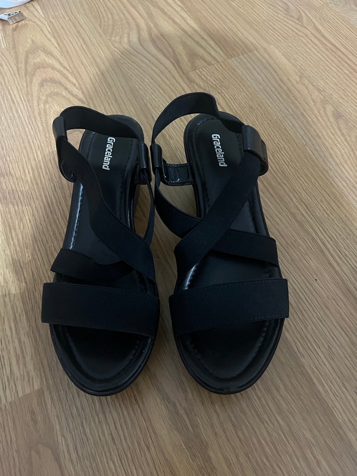 Siyah dolgu topuklu sandalet, lastik kayışlar ve tokalı kapanışa sahip. Trendy casual dış mekan kullanımı için minimal ve desensiz tarzda.