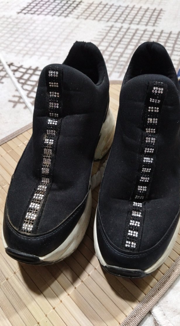Siyah kadın dolgu topuklu spor ayakkabılar, cırt cırtlı ve ön kısmında parlak taş detaylıdır. Günlük sokak stili için uygundur.