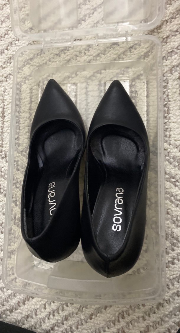 Siyah kadın dolgu topuklu stiletto ayakkabılar, minimalist tasarım ve cırt cırtlı kapanış ile, ofis kullanımı için uygun.