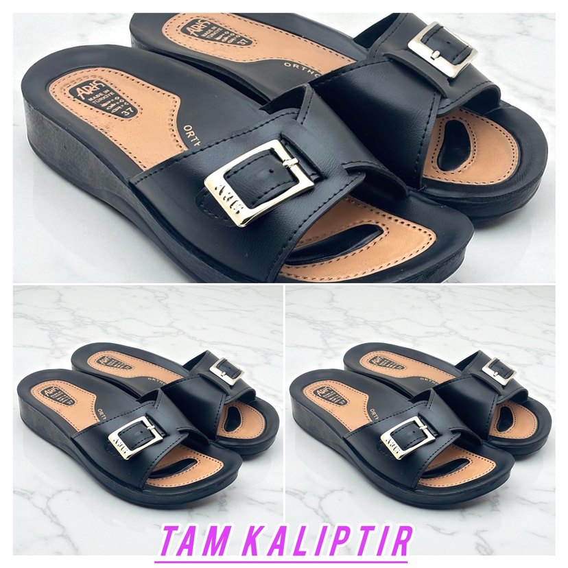 Siyah, tokalı bantlı, dolgu topuklu kadın terlikleri, günlük kullanıma uygun sade ve minimalist tasarıma sahiptir. İç kısmında "TAMKALIPTIR" yazısı bulunmaktadır. (3LÜ SET OLARAK GÖNDERİLECEKTİR NUMARAYI BANA MESAJ YAZARAK BELİRLEYEBİLİRSİNİZ)