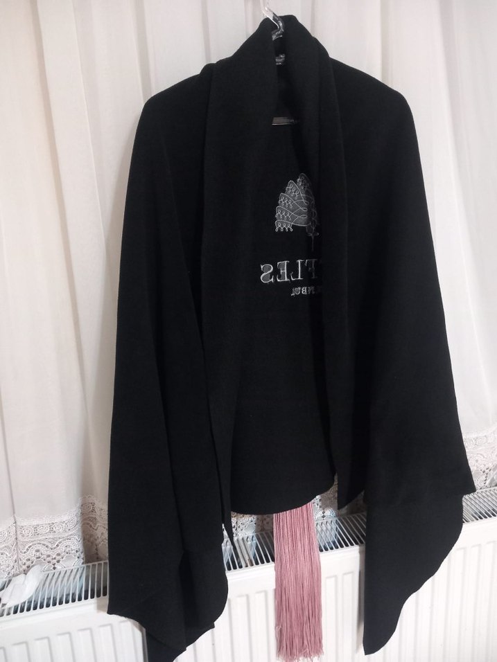 Siyah renkte, yumuşak ve sıcak kumaştan yapılmış kadın drapeli goth şal, rahat ve avant-garde bir stil sunar.