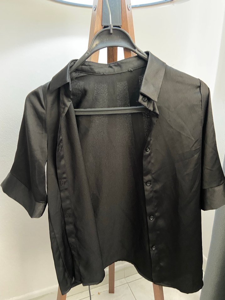 Siyah renkli, düğmeli, kısa kollu, yakalı kadın gömleği. İpeksi kumaştan, normal midi boyda ve bol kesim. Minimalist sokak stiline uygun, günlük kullanım için ideal.