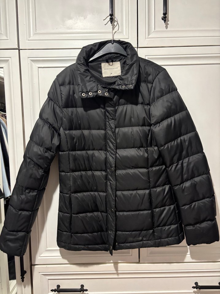 Siyah renkte, düğmeli, notched lapel yakalı, uzun kollu kadın kışlık mont. Sentetik kumaştan, günlük kullanıma uygun, bele oturan kesime sahip.