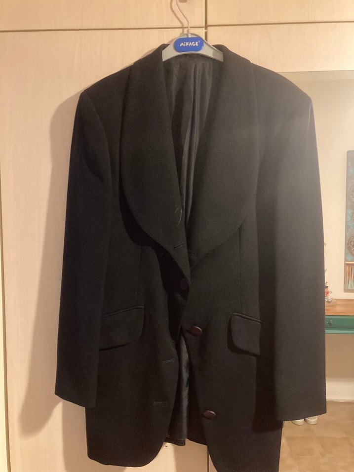 Düğmeli, yakalı ve uzun kollu siyah kadın blazerı, ipeksi kumaştan, klasik ve gotik tarzda, ofis için uygun.