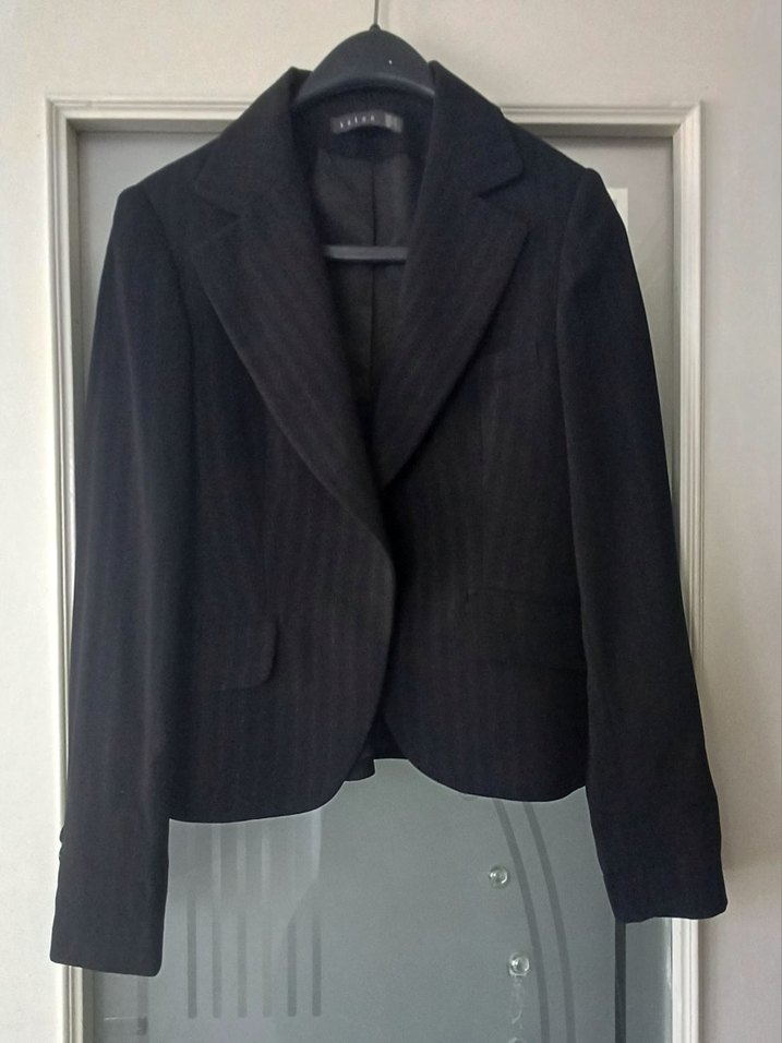 Siyah, düğmeli ön ve kesik yakalı, uzun kollu kadın blazer ceket. Ofis için uygun, normal kesim ve ipeksi kumaştan üretilmiştir.