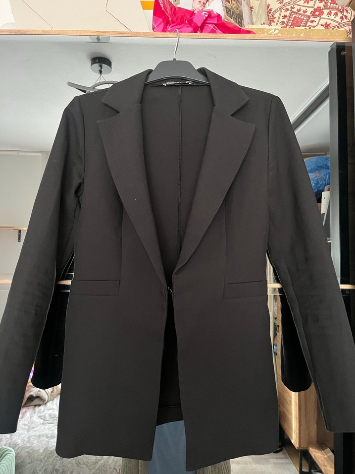 Siyah renkte, düğmeli ve çıtçıtlı ofis blazeri. Notlu yaka, normal kesim, uzun kollu ve midi boyda, sentetik kumaştan üretilmiştir.
