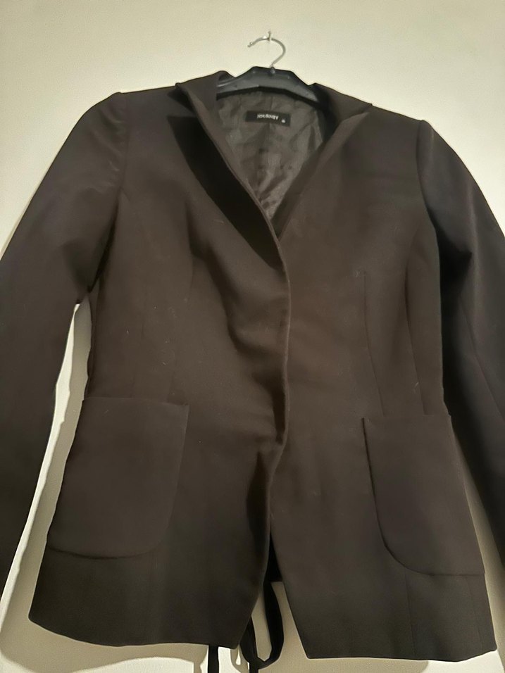 Siyah, düğmeli, ipeksi kumaştan kadın blazeri. Normal kesim, uzun kollu ve yakası kesik. Ofis ve sokak modasına uygun.kadin takım elbise üstte duruşu çok guzel