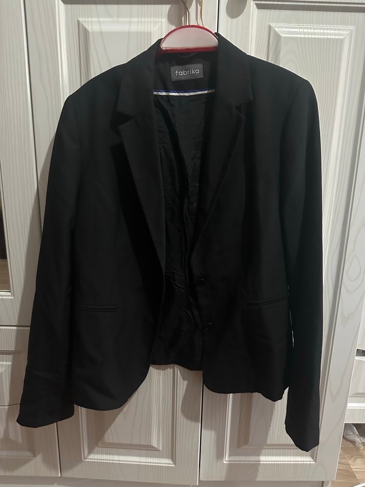 Siyah, düğmeli, notched lapel yakalı kadın blazeri, uzun kollu ve ipeksi kumaştan. Ofis için uygun, midi boyda ve regular fit. Boyu 63 cm koltukaltı 50 cm