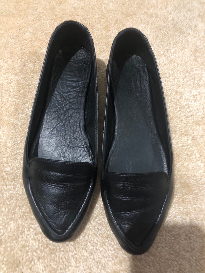 Siyah renk, blok topuklu kadın düz ayakkabılar. Minimalist ve gotik stile sahip, rahat ve günlük kullanım için uygun. Hakikş deri babet 38no tam kalıp tertemiz sorunsuz