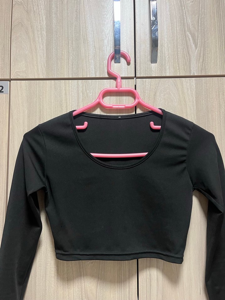 Siyah renkli, elastik kumaştan yapılmış, uzun kollu, yuvarlak yakalı ve crop kesim kadın bluz. Spor ve günlük sokak stili için uygundur.
