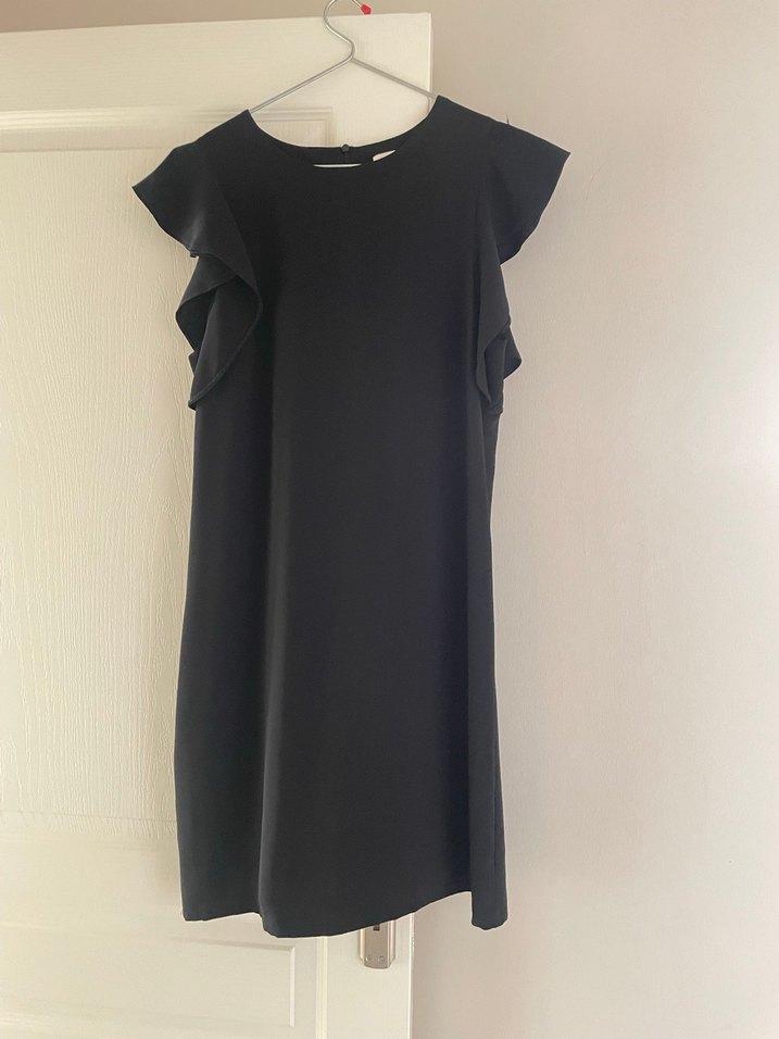 Siyah midi elbise, kısa kollu, ruffle detaylı, yuvarlak yakalı ve bol kesimdir. Minimalist tarzda, günlük kullanıma uygundur.