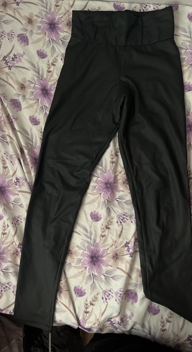 Siyah, esnek bel bantlı, düz desenli kadın deri tayt. Günlük rahat kullanım için uygundur.