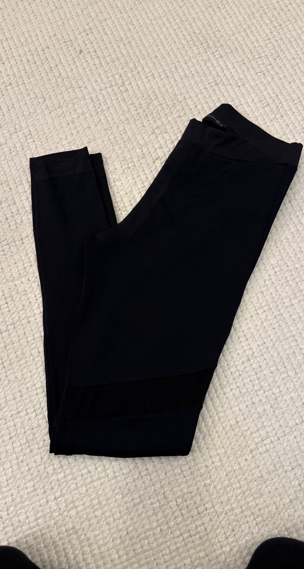Esnek sentetik kumaştan yapılmış, siyah, vücuda oturan kadın midi tayt, ofis ve sokak stili için uygundur.