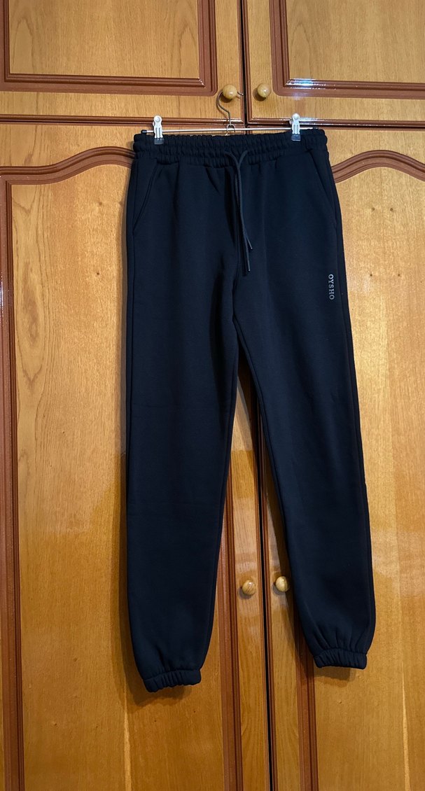 Siyah, rahat kesim kadın eşofman altı, yumuşak ve sıcak kumaştan, lastikli bel ve bileklerle spor ve günlük kullanıma uygun.