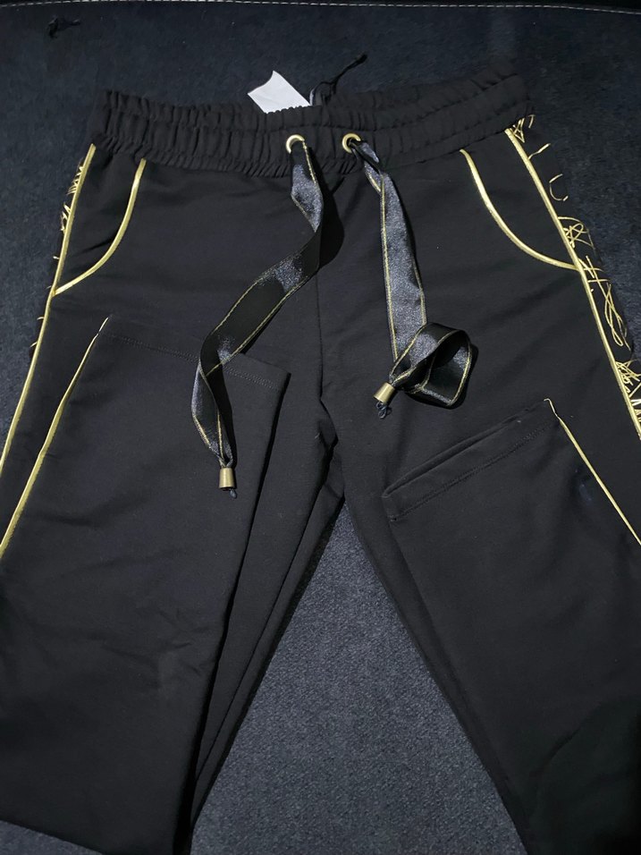 Siyah kadın eşofman altı, cepler ve bağcıklı bel ile. Düz, sentetik kumaştan, regular fit ve streetwear tarzında. Hiç kullanılmamıştır, bazı beyaz lekeler vardır ama yıkanınca hemen çıkar