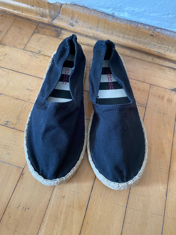 Siyah dolgu topuklu espadriller, kauçuk tabanlı, minimalist ve bohem tarzda, günlük kullanıma uygun. Zahmetsiz şıklık sunar.