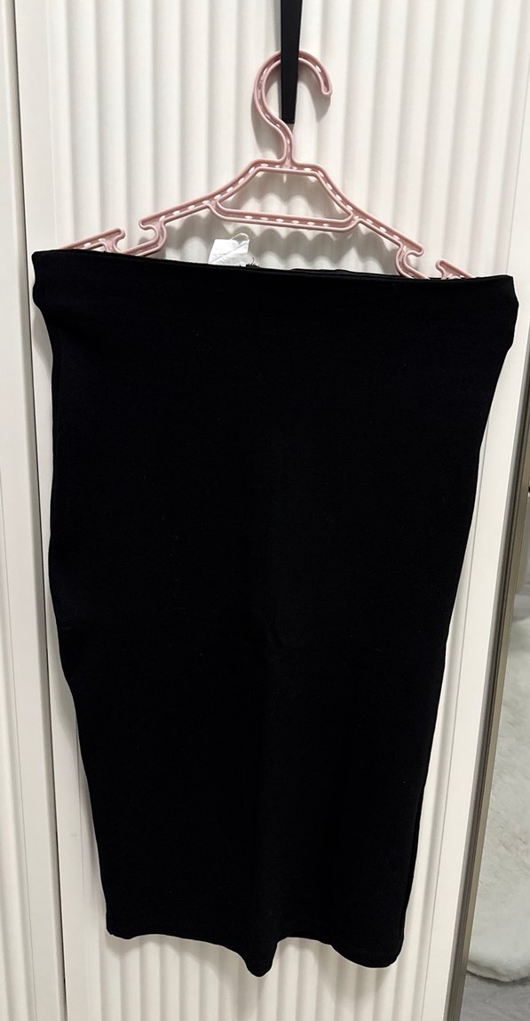 sentetik kumaştan yapılmış, siyah renkli, uzun ve vücuda oturan kadın eteği. Günlük kullanıma uygun minimalist tarzda.