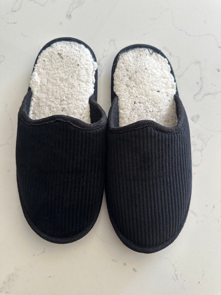 Kadınlar için düz tabanlı, siyah renkte sade tasarımlı, yumuşak iç yüzeyli ev terliği.