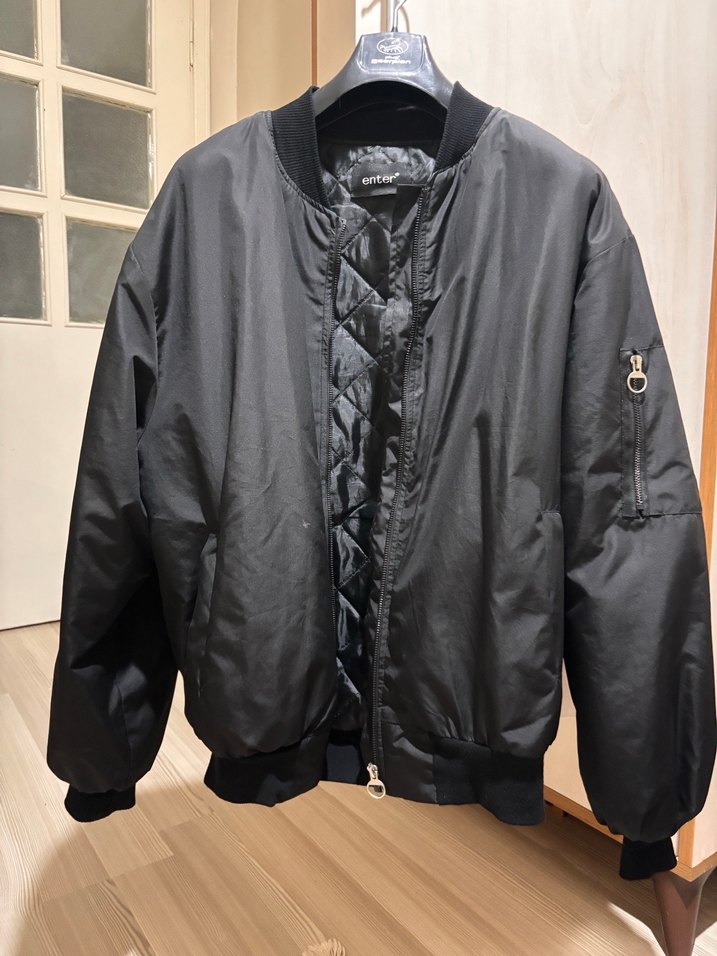 Siyah renkli, fermuarlı ve bol kesim kadın ceket. Sentetik kumaştan, uzun kollu ve çıtçıtlı yakaya sahip. Midi boyda, günlük sokak stili için uygun.