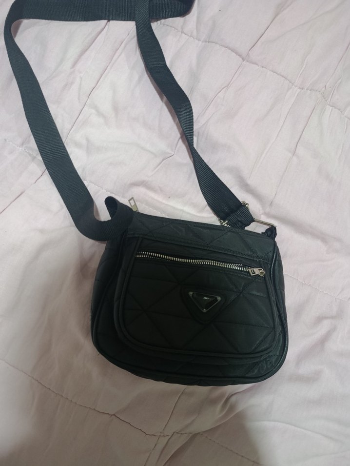 Siyah renkli, fermuarlı ön cepli, sentetik kumaştan yapılmış kadın çantası. Minimalist ve streetwear tarzında, ayarlanabilir omuz askılı. Trendy casual görünüm için uygun.