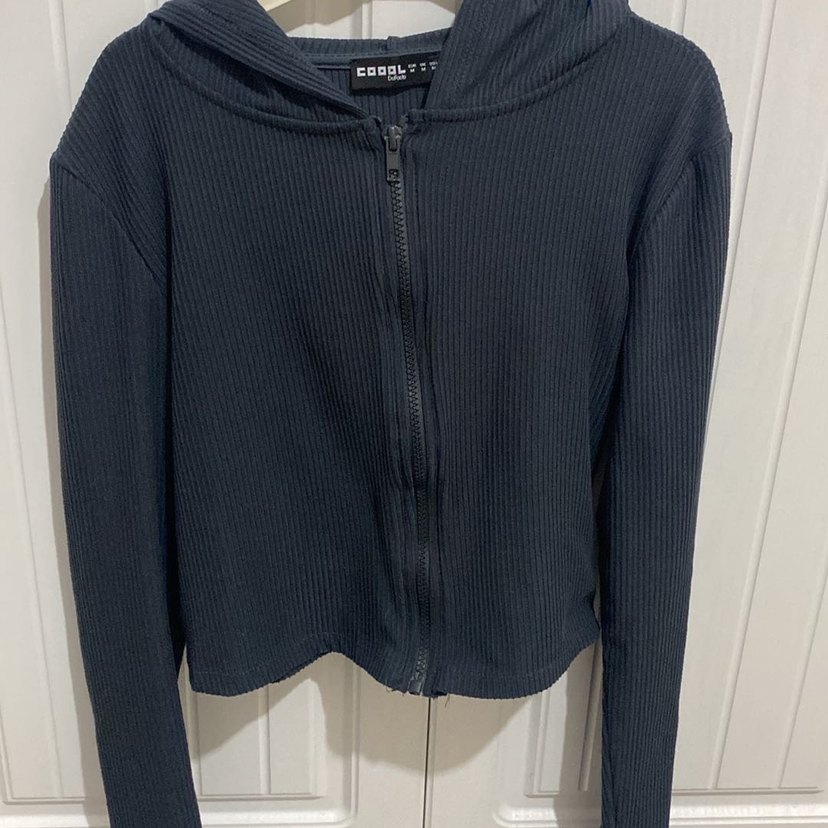 kumaştan, fermuarlı ve uzun kollu siyah kadın ceketi. Normal midi boyda, bisiklet yaka ve günlük kullanıma uygun sokak stili.