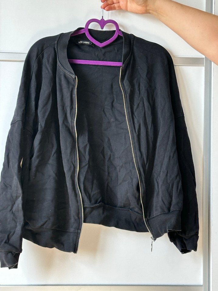 Siyah , fermuarlı, uzun kollu, normal midi uzunlukta, salaş kesim kadın ceketi. Spor ve günlük stil için uygundur.