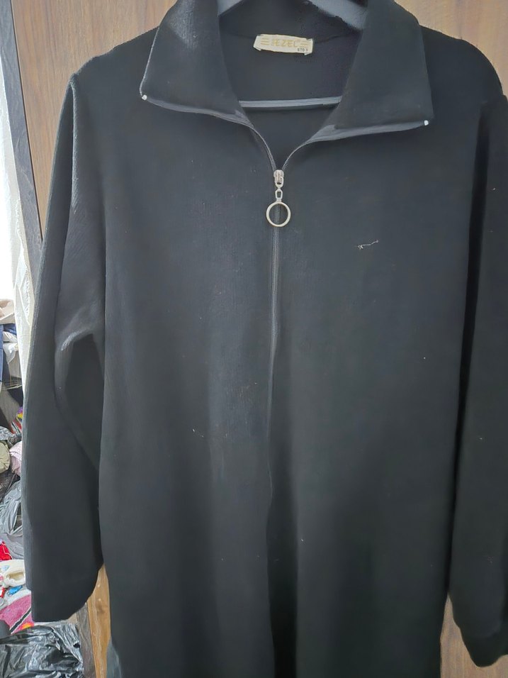 Siyah, yüksek yakalı, uzun kollu, bol kesim hamile ceketi. Yumuşak ve sıcak kumaştan, fermuarlı, minimalist sokak stili, günlük kullanım için uygundur.