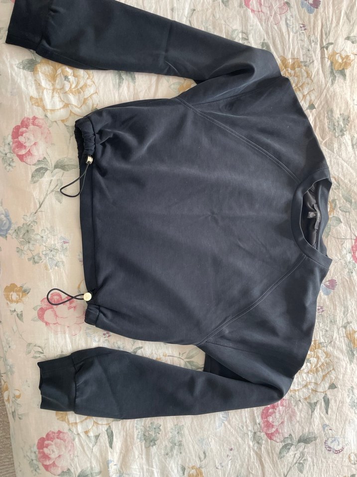 Siyah renkli, yuvarlak yakalı, uzun kollu ve bol kesim kadın sweatshirt. Fermuarlı detaylara sahip, sentetik kumaştan üretilmiştir. Crop
