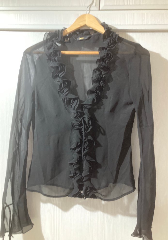 Siyah, uzun kollu, v yaka ve fırfırlı detaylara sahip, ipeksi dokulu, normal boyda, dar kesim gotik kadın gömleği.